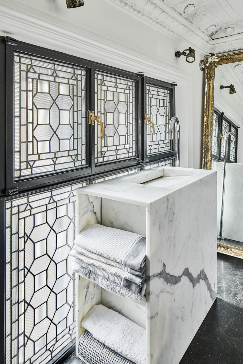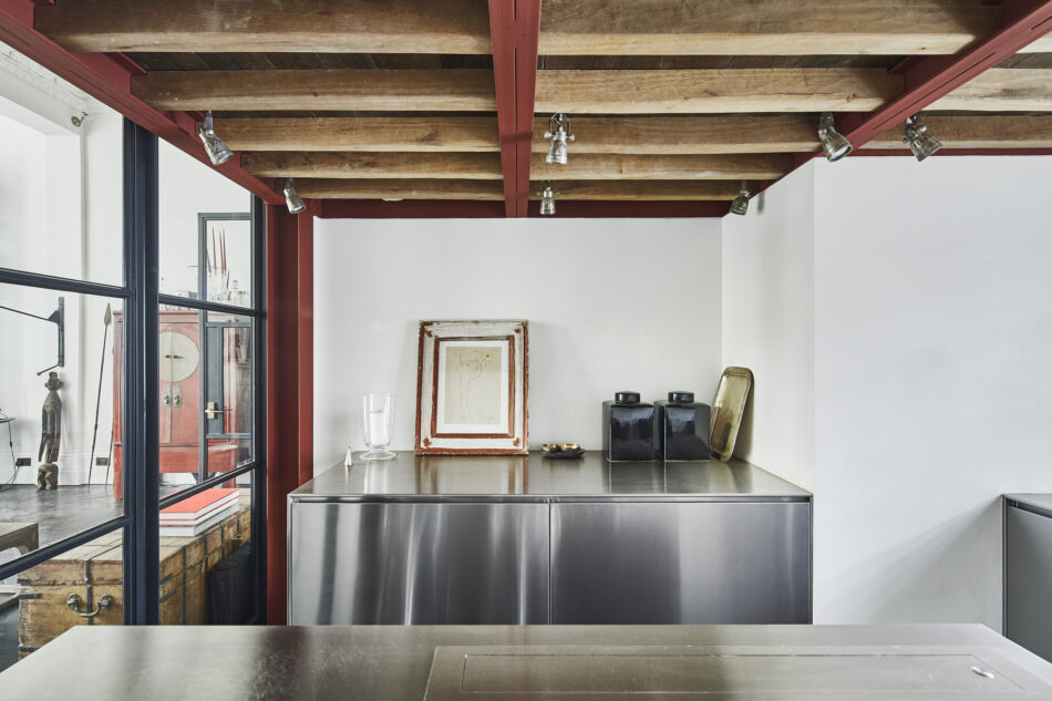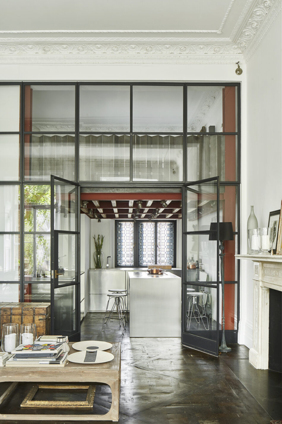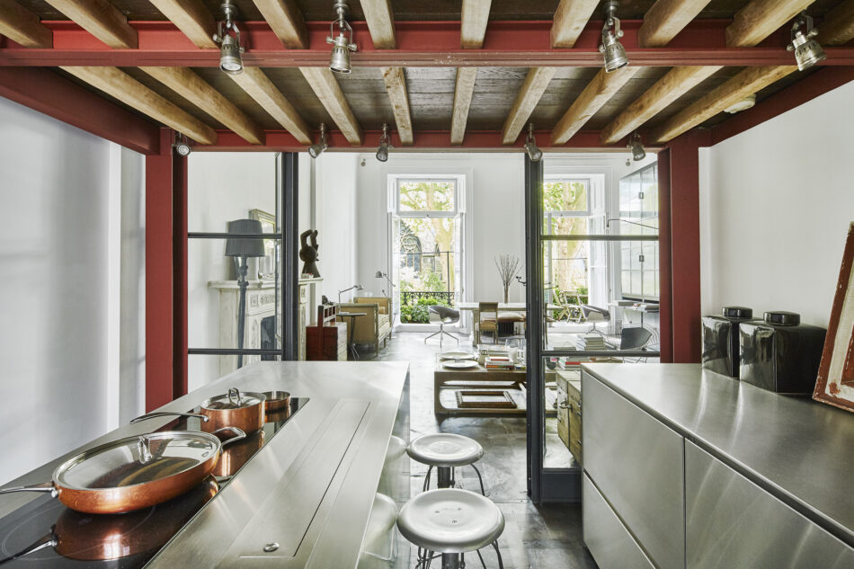 New and old are matched brilliantly throughout. Flooring across the lower level is a supremely elegant, reclaimed hardwood parquet laid in a Versailles pattern. This extends into the kitchen, where bespoke modular units in stainless steel conceal appliances by Fisher & Paykel, Gaggenau and Siemens. Exposed timber beams reach between lengths of red-painted structural steel, and beautiful latticed windows provide secondary glazing to the rear lightwell.