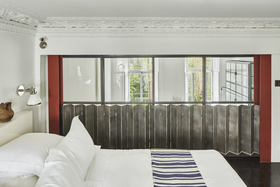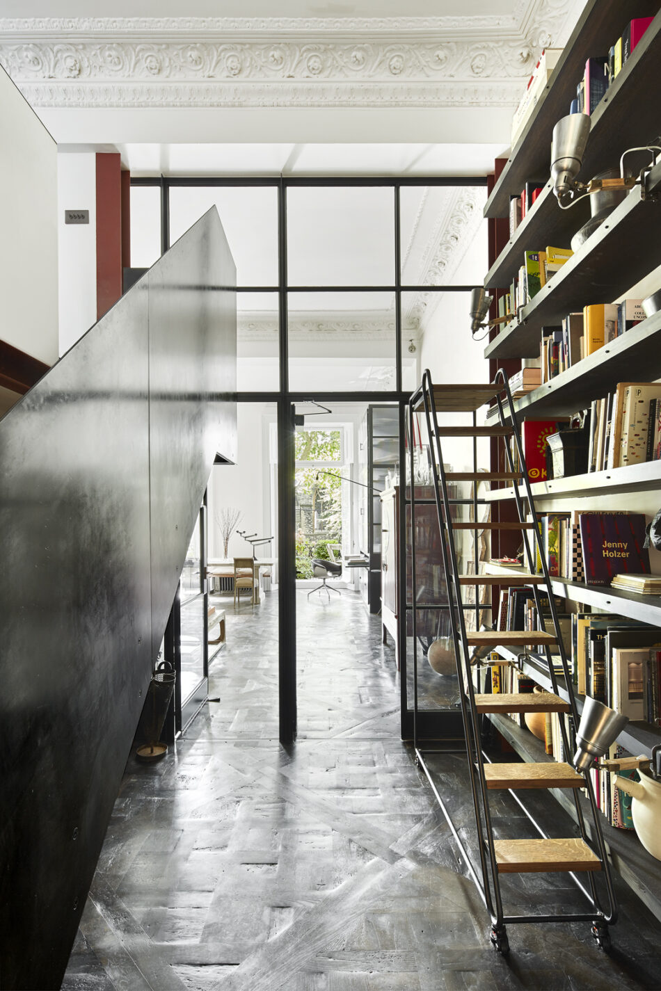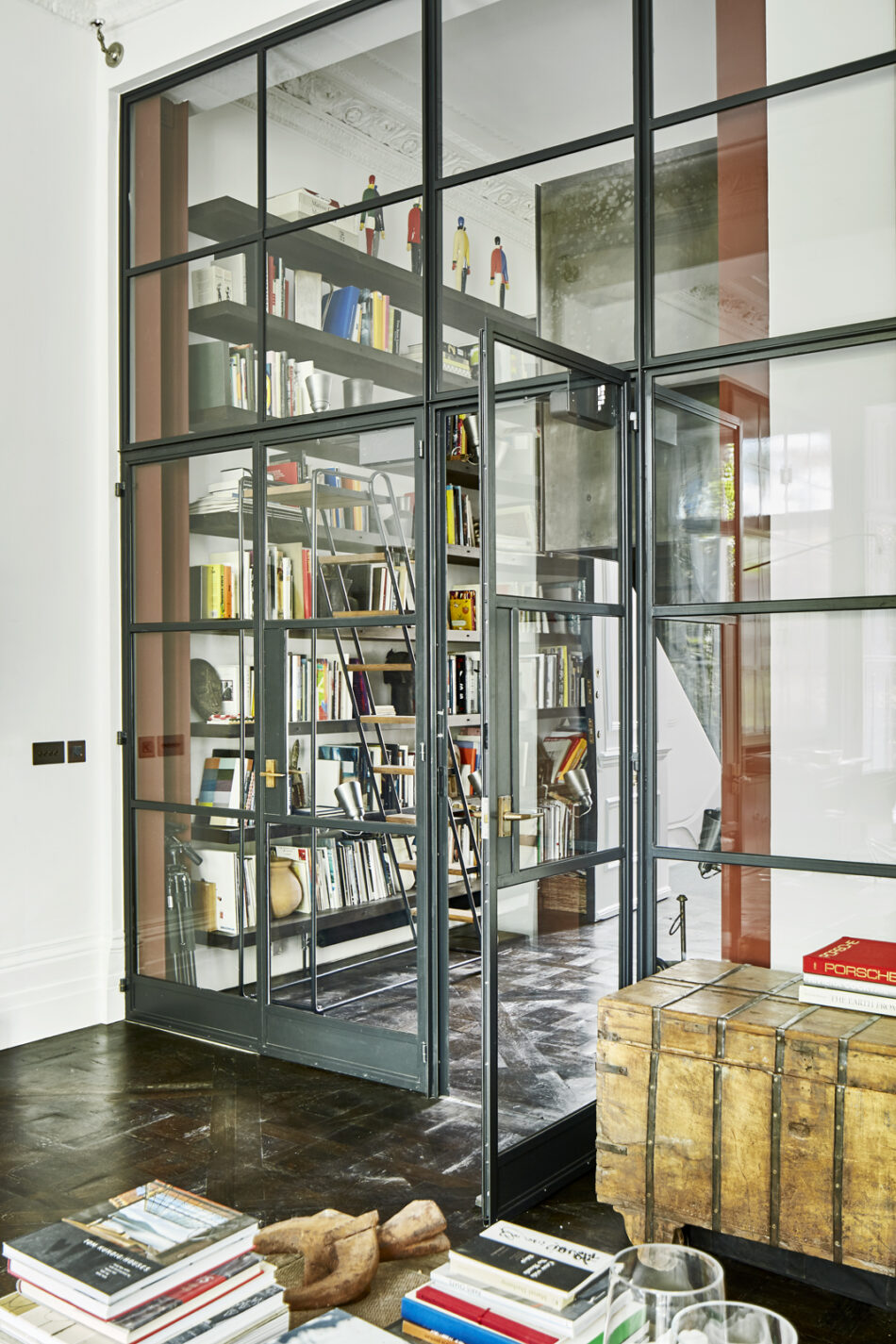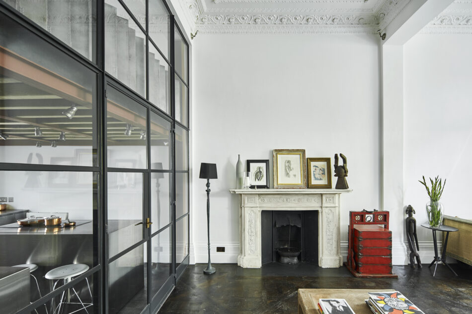 A covered porch provides access to the wide, well-lit communal staircase (there is no lift). The interior design seizes on the dramatic scale offered by four-meter-high ceilings and huge south-facing French windows at the front aspect. Light fills the space and is drawn through an excellent wall of fire-rated Crittall that separates the living space from all others.