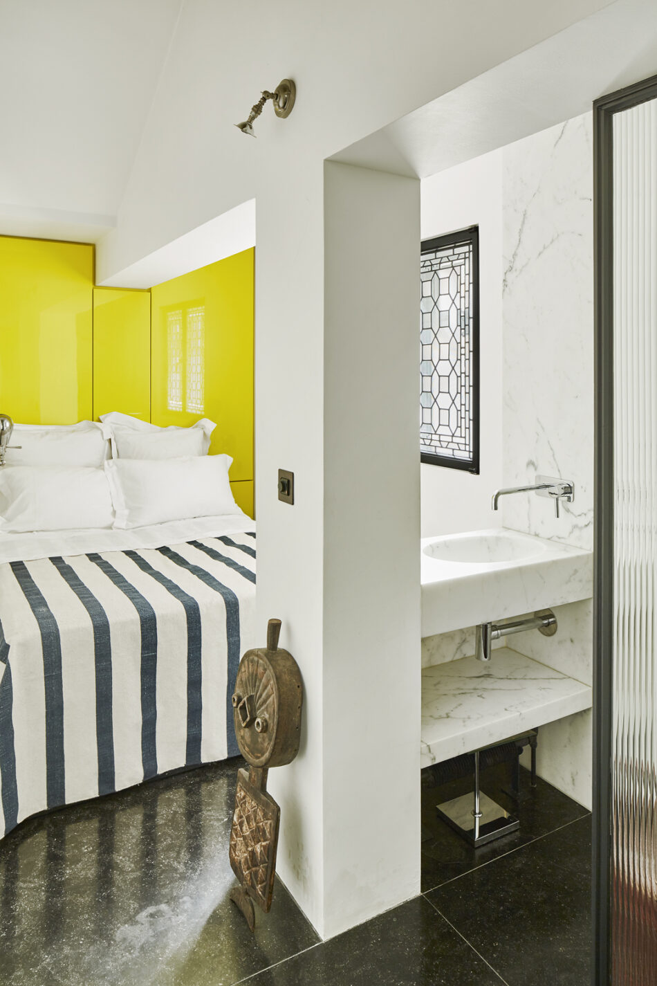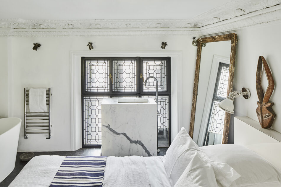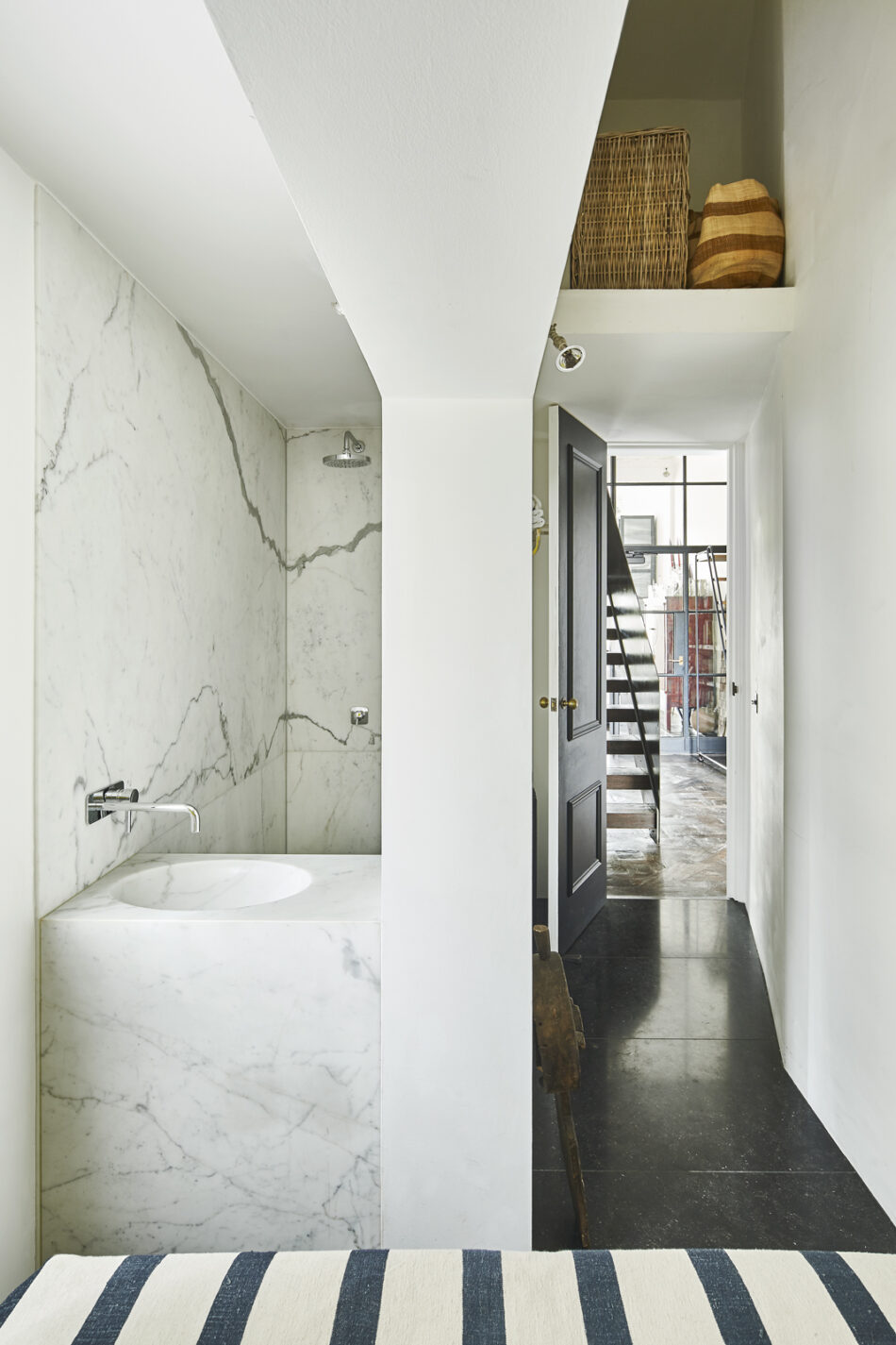 Above, accessed via a custom-made steel staircase, is an oak-framed mezzanine level containing the main bedroom. This has a wonderful freestanding marble sink, bath, and concertina steel blinds across the upper Crittall section. There is a further room, which has in the past been used as a dressing room and occasional bedroom, at the rear of the lower level, laid with granite flooring, with a brilliantly incorporated en suite walk-in shower in Carrara marble. Next to it is the guest WC, which is set behind a sliding steel door and clad in blue piano-lacquer panels.