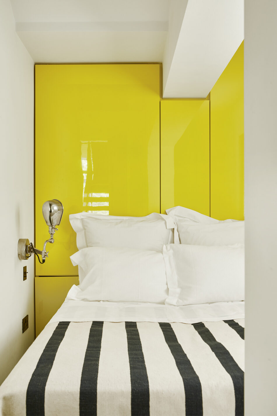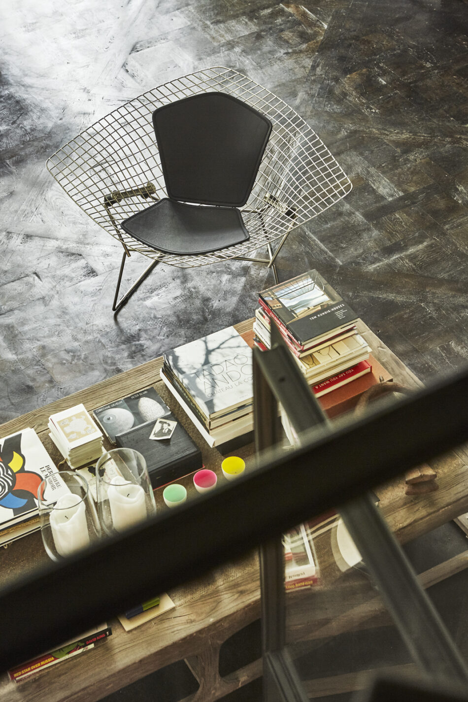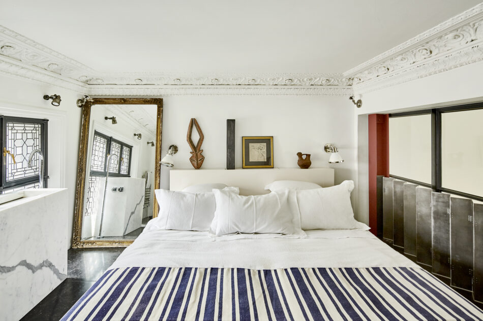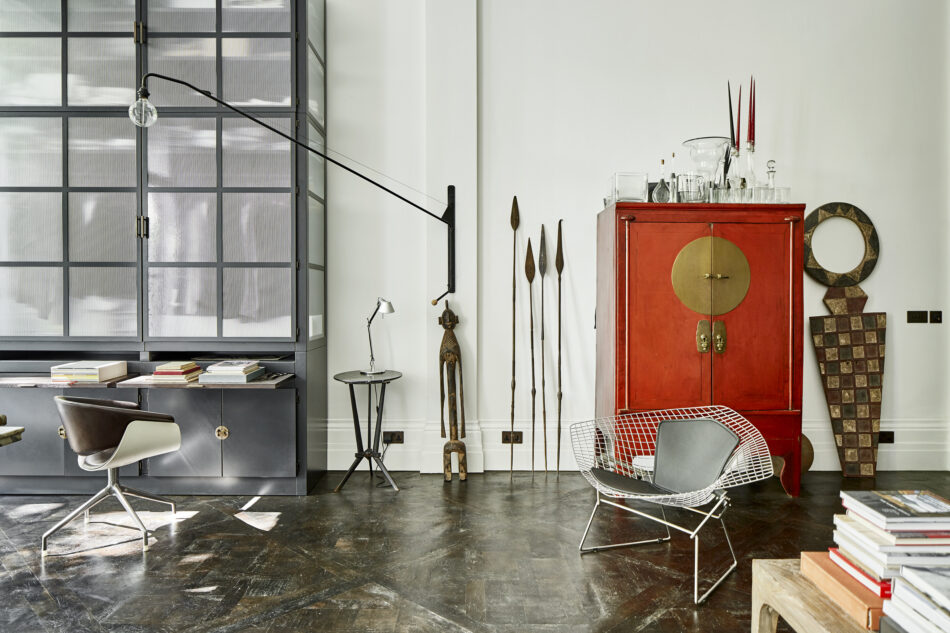 Above, accessed via a custom-made steel staircase, is an oak-framed mezzanine level containing the main bedroom. This has a wonderful freestanding marble sink, bath, and concertina steel blinds across the upper Crittall section. There is a further room, which has in the past been used as a dressing room and occasional bedroom, at the rear of the lower level, laid with granite flooring, with a brilliantly incorporated en suite walk-in shower in Carrara marble. Next to it is the guest WC, which is set behind a sliding steel door and clad in blue piano-lacquer panels.