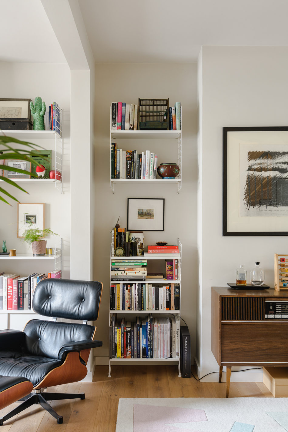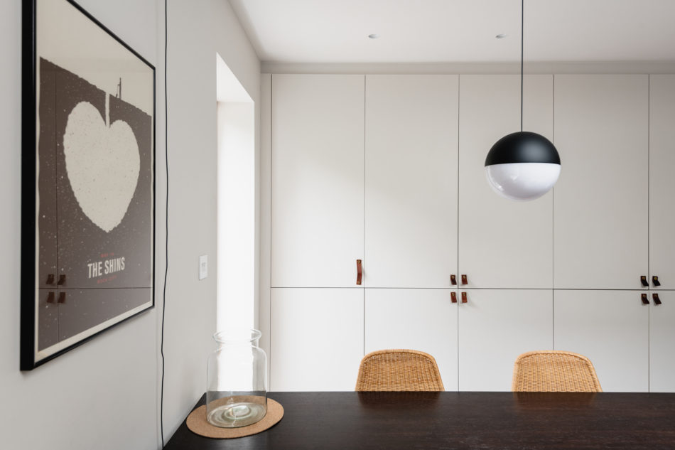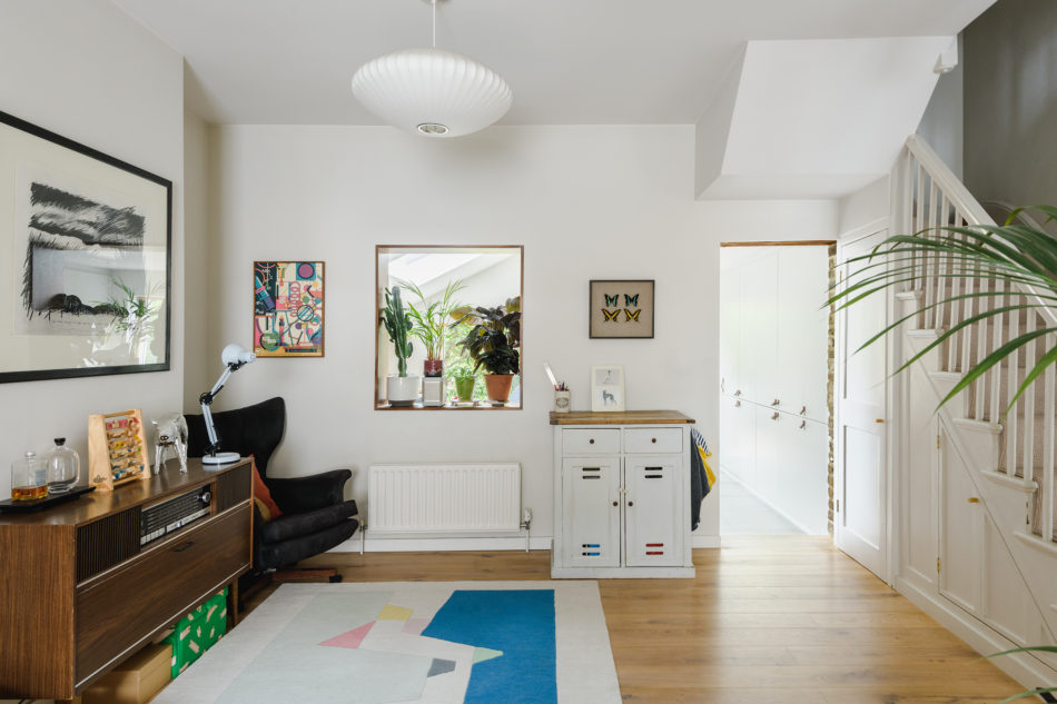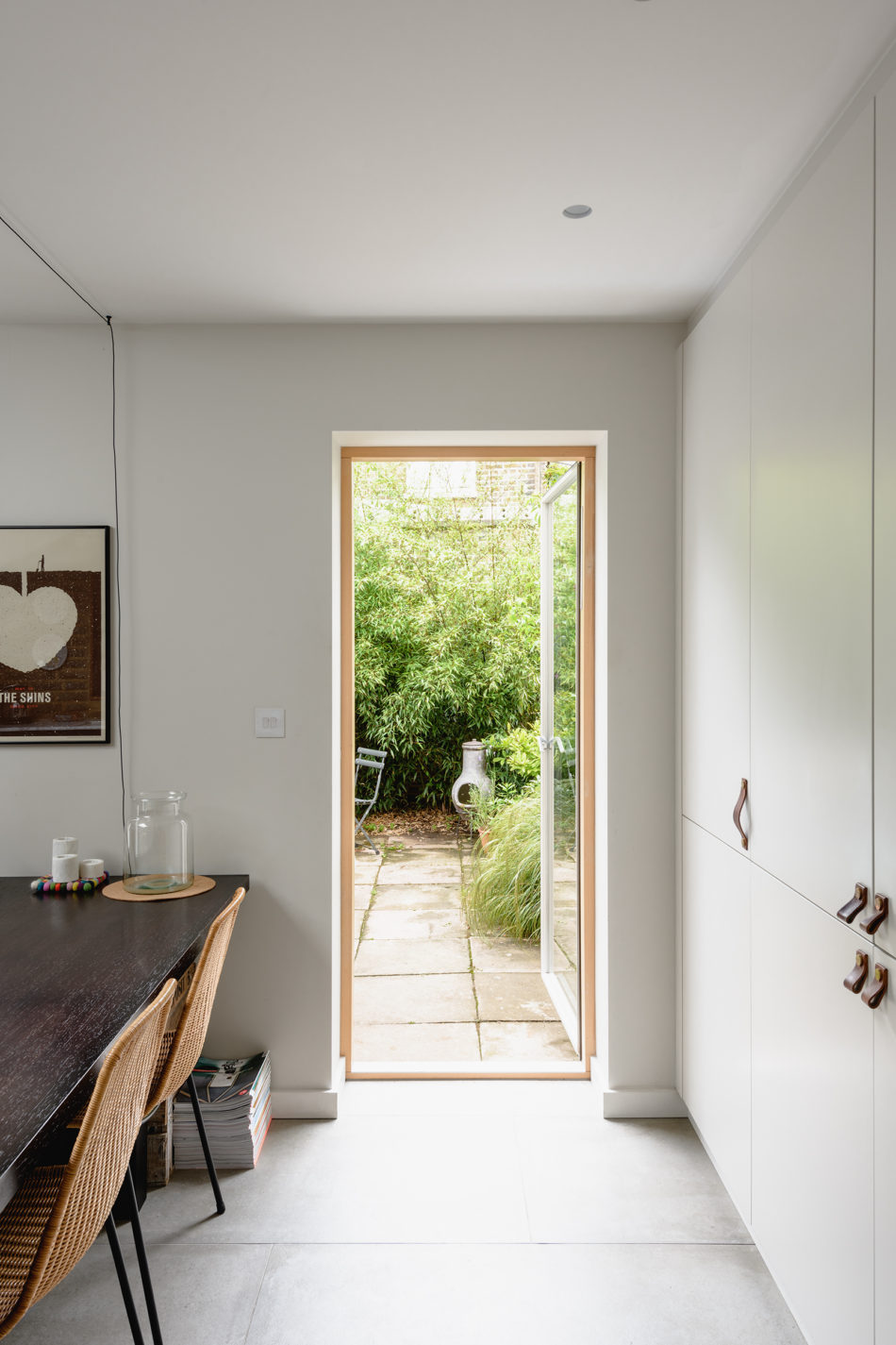 Downstairs is largely open-plan, although the architects deliberately left vestiges of the original walls in place in order to delineate the different living spaces. To the front of the house is a sitting room, centred around a minimal brick fireplace.