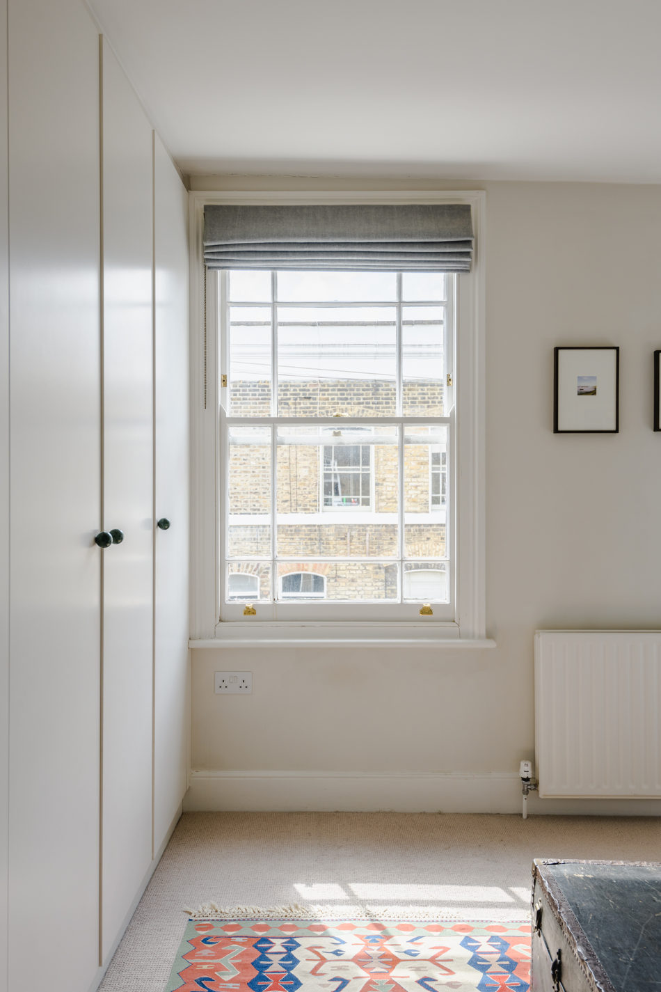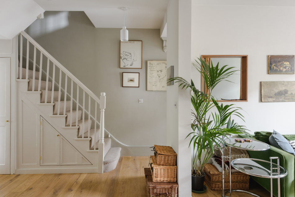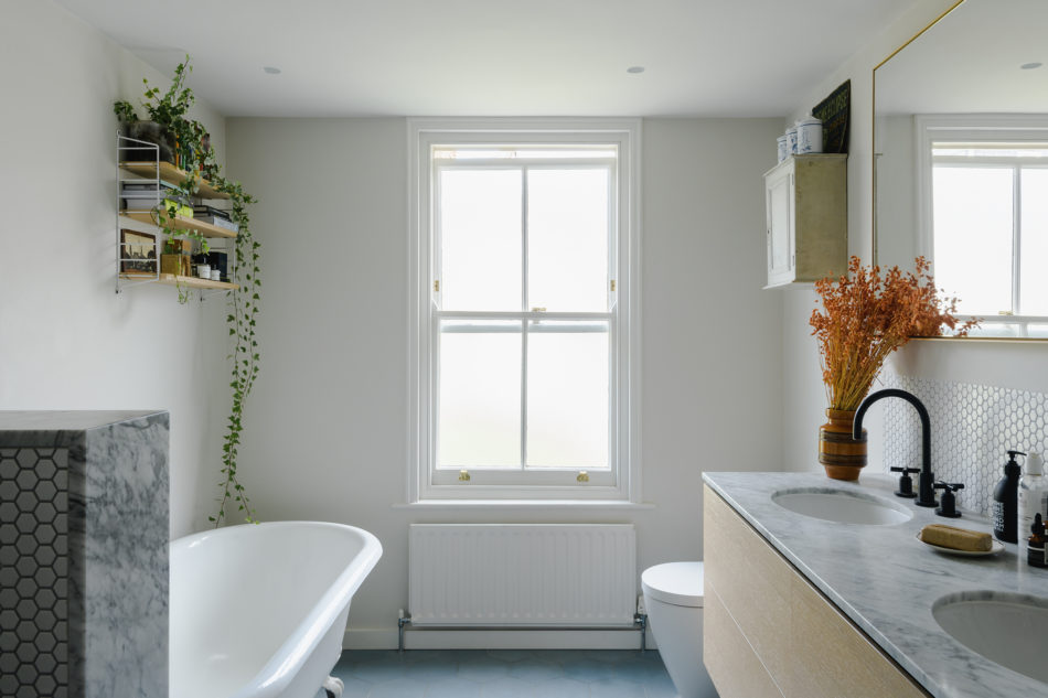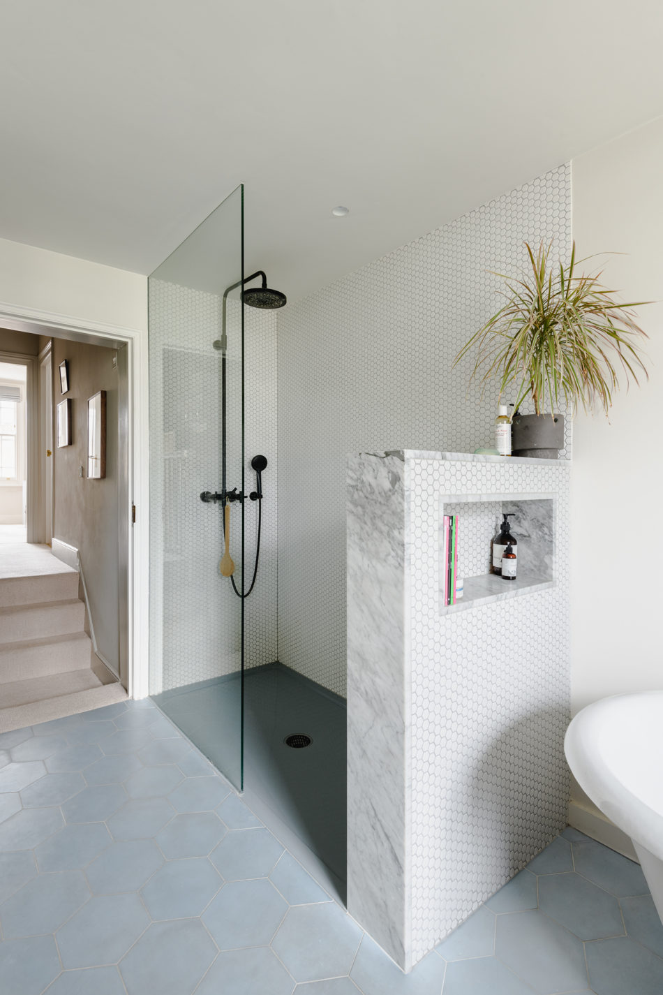 The hallway and stairwell have been painted grey, in a variety of tones. The hallway is lighter, leading to a darker wall around the staircase, which ascends to two, bright, double bedrooms. The large family bathroom which serves both bedrooms, is a wonderfully luxurious room, with a freestanding bath, a his-and-hers sink, and a generous wet room. Carrara marble has been used here too, to create a consistent aesthetic throughout the house. Although this is part of the older house, the owners have deliberately modernised the space using matte-black fittings, and pale-blue hexagonal floor tiles.