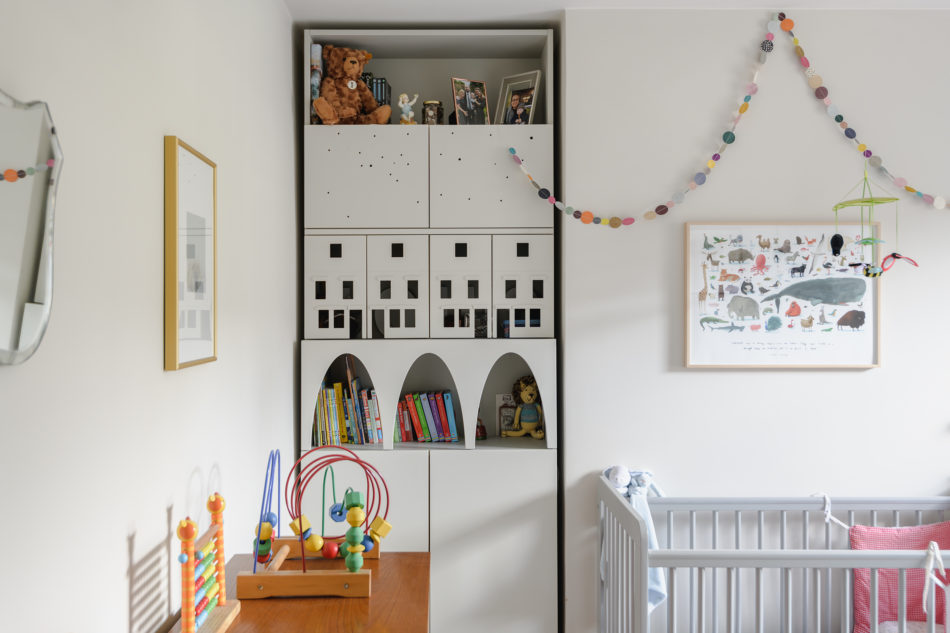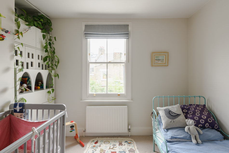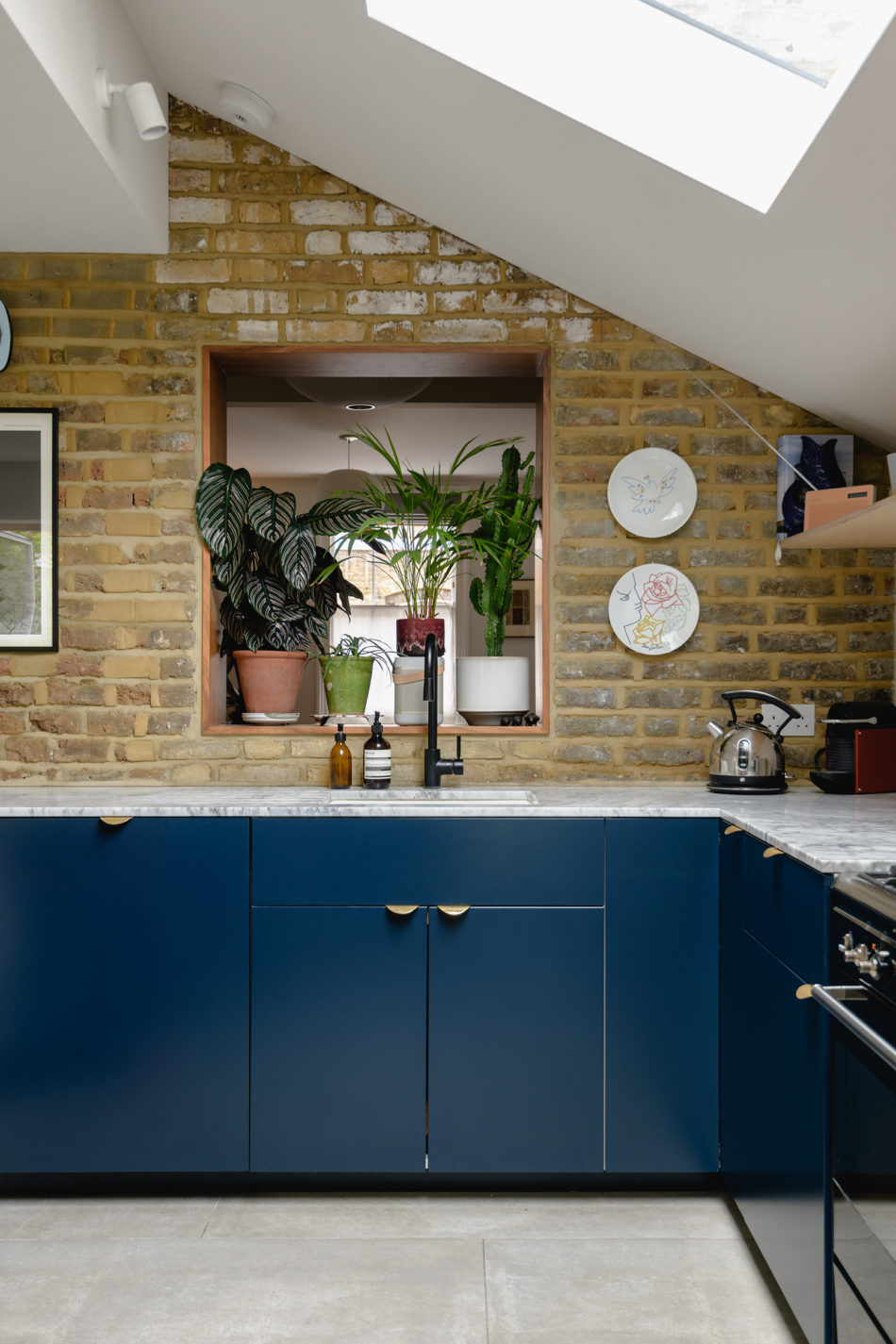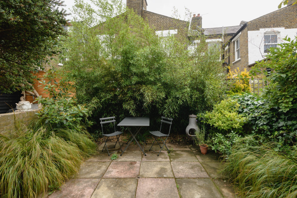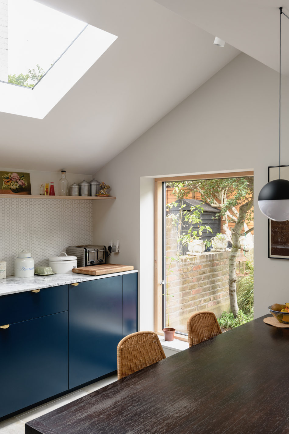 The middle space, now used as an extension of the living room and as a play area for a young child, was previously a spacious dining area. Engineered-oak floorboards run underfoot, leading to an open doorway and steps down into a modern side-return, which houses a generous, well-conceived kitchen. Three large windows; a skylight, a glazed door opening onto the garden and a large picture window, with walnut frame, fill the space with light. Plywood cupboards, painted bespoke cabinetry, concrete-effect tiles and Carrara marble counter-tops chime with the exposed-brick of the original external wall, to create an entirely contemporary re-interpretation of the Victorian house. Beyond is a paved garden with space for table and chairs, bordered with planted flower beds.